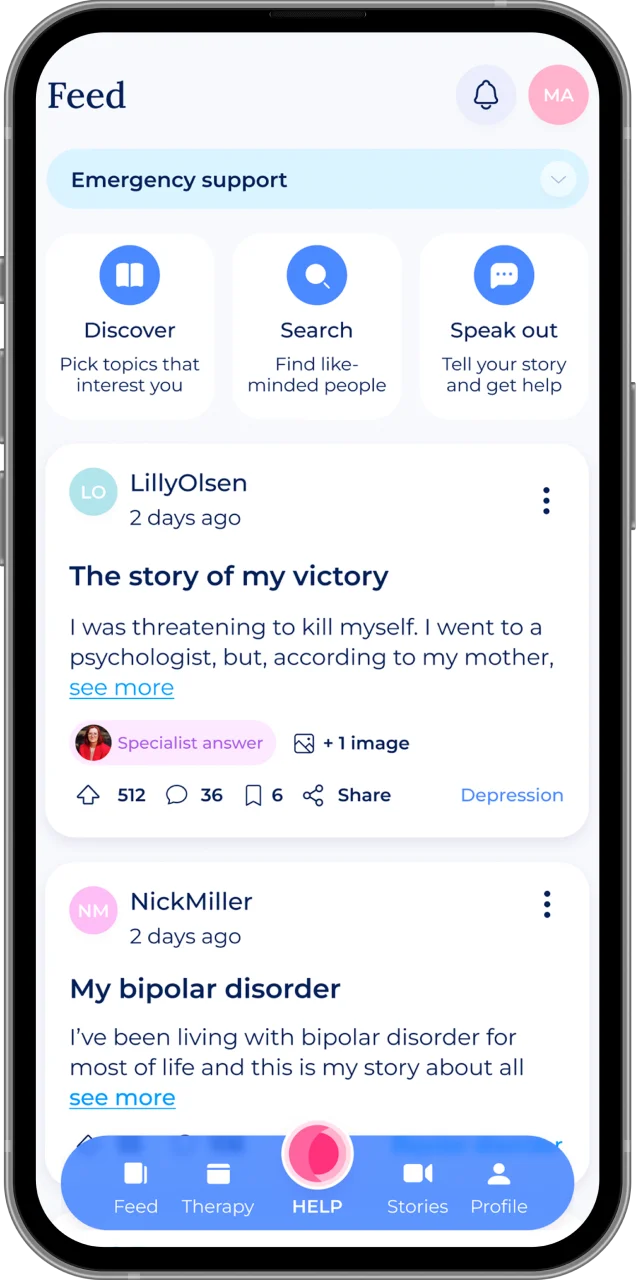 We’re open to any topic that concerns you including bipolar disorder, self-harm, anxiety, major depression, stress, abuse, trauma, and many more. The only rule is to follow our rules (see question №5).